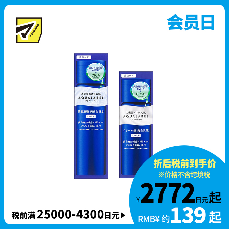 [套装内容]1,4909978180119 资生堂水之印 透亮修护 高机能焕白提亮 化妆水 滋润型 170ml SHISEIDO AQUALABEL 防止黑色素生成 改善暗沉 淡化色斑2,4909978180300 资生堂水之印 透亮修护 长效补水焕白 乳液 滋润型 130ml SHISEIDO AQUALABEL 防止黑色素生成 改善暗沉 淡化色斑雀斑 毛孔改善