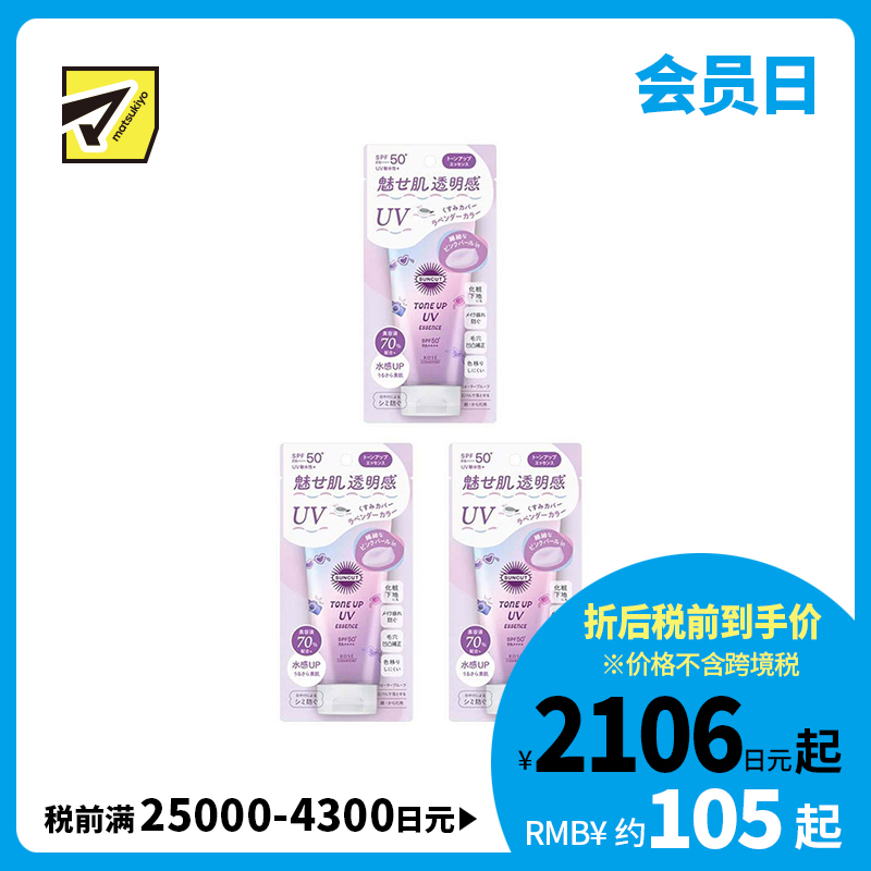 [商品名称]高丝SUNCUT 轻盈触感 修饰暗沉 提亮防晒美容精华 SPF50+ PA++++ 薰衣草紫 80g 3个装 高效紫外线防护 高保湿配方 均匀肤色 多重保护