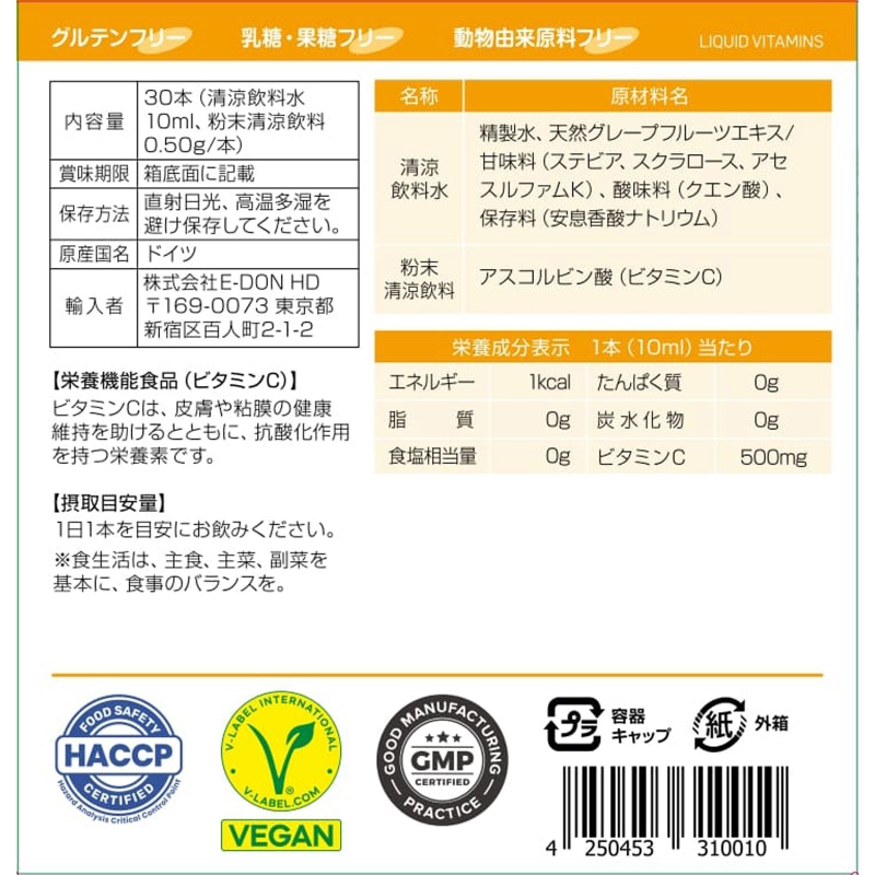 [商品介绍] 在快节奏的都市生活中,是否常感到身体疲惫、肤色暗沉,即便服用各种维生素片剂也收效甚微?很多时候,普通片剂在消化过程中吸收缓慢,且长时间存放易导致活性成分流失,无法真正满足您对高效补给的期待。这款诞生于德国的纯维生素C浓缩精华营养液,为您带来了全新的补给体验。采用创新的二层构造瓶体设计,将高纯度维生素粉末与液体分离储存,确保在饮用前的那一刻才进行鲜活混合,让维C的力量瞬间释放。相比传统片剂或胶囊,液态剂型更加易于吞咽且能更快速地被体内吸收。坚持高品质、安全的配方设计,排除对人体不利的添加剂,且完全符合纯素要求。每一小支都蕴含 500mg 维生素C,相当于每日营养需求量(18岁以上基准)的 500%。如果你希望在忙碌生活中,更方便地为自己补充维生素C,这种即饮型设计,或许能让补充营养这件事变得简单一些。