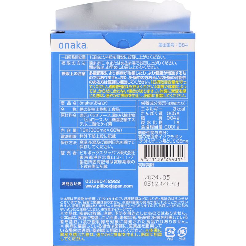 [商品名称] PILLBOX JAPAN 葛花萃取 减少腹部脂肪形成 保持腹部轻盈 营养片 60粒 onaka 控制腰围变化 适合BMI偏高人群