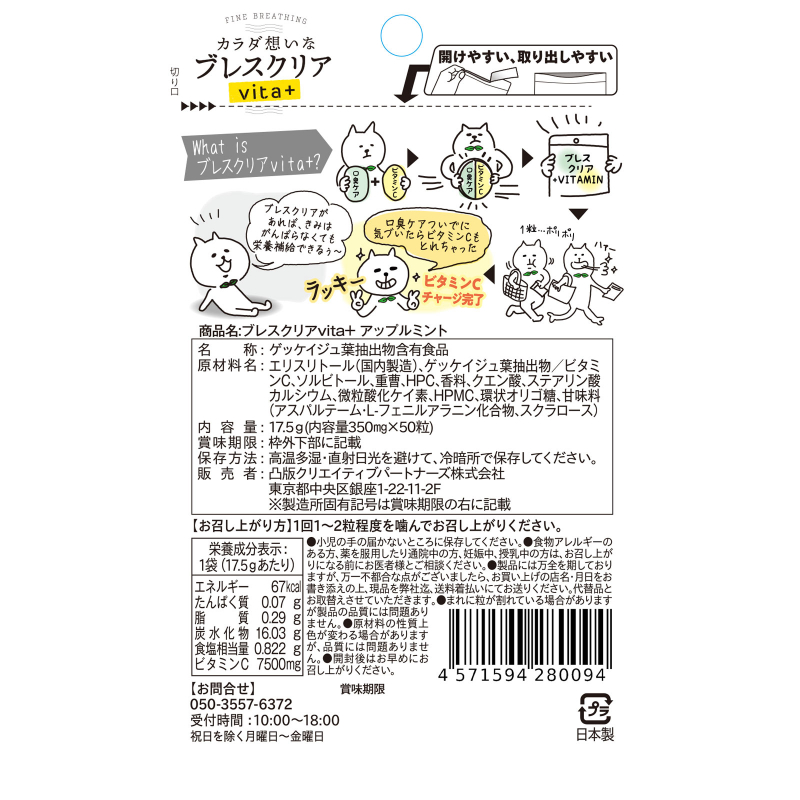 [商品介绍] 适合在对口腔气味感到在意的时刻随手服用。无需吞咽,轻轻咀嚼即可,伴随微微起泡感搭配清新的苹果薄荷风味,让口腔体验更轻松。配方中添加月桂叶提取物,并在一袋中含有维生素C 7500mg,可在日常口腔护理的同时补充营养。无论是用餐后、戴口罩时、工作间隙,还是运动后想转换一下状态,这种不受时间限制的咀嚼型设计,都能让你在不同生活场景中更从容应对口腔异味带来的不安感。