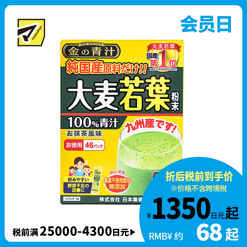 [商品名称]日本药健 黄金青汁 大麦若叶 青汁 抹茶口味 补充膳食纤维 改善蔬菜摄取不足 3gx46包