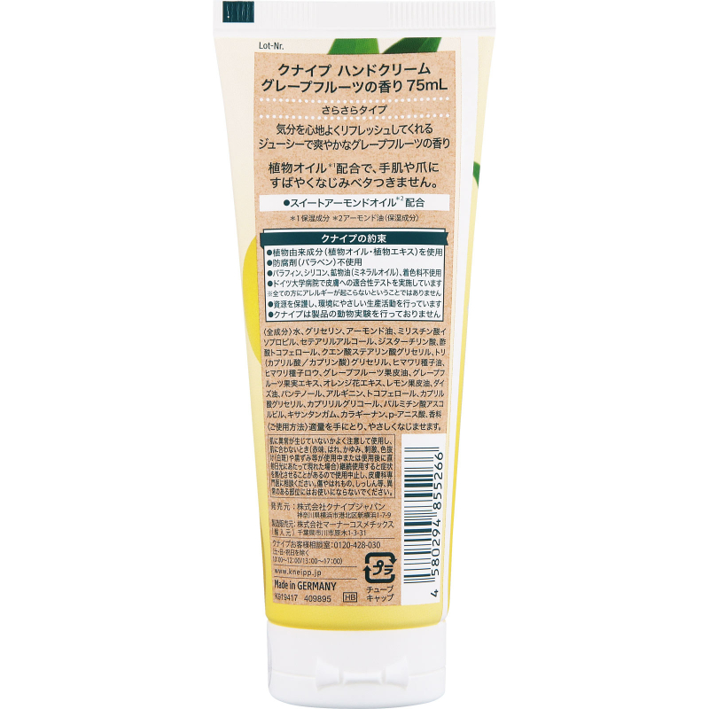 [商品名称] KNEIPP 天然植物精华 清爽滋润 不粘腻 护手霜 75ml 葡萄柚香 易吸收 呵护指缘 敏感肌 甜杏仁油
