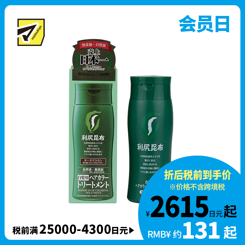[商品介绍]混合了奢华的天热利尻海带提取物。海带中含有的美容成分赋予头发和头皮光泽和滋润。昆布不但能吃,还能用来染发哟。利尻昆布染发系列4年蝉联日本同类产品销量榜首!28种植物精华,无硅配方,没有刺鼻性化学味道,肌肤敏感者也能使用。这款是自然的深棕色,衬出白皙好肤色。