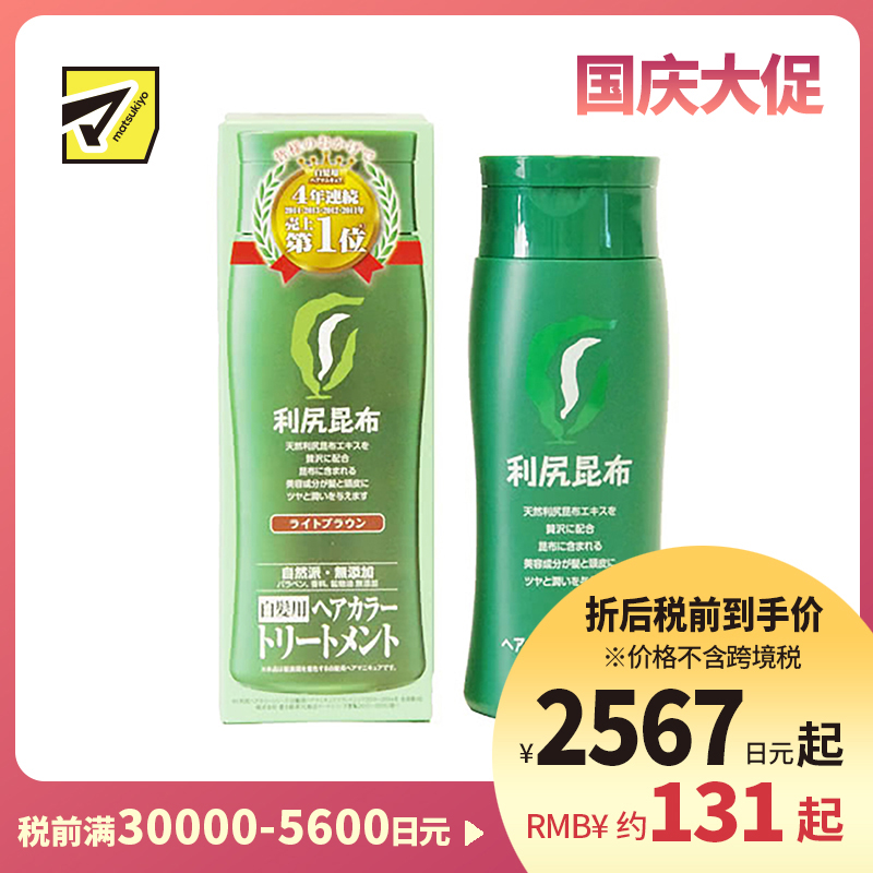 [品牌]利尻昆布[商品名称]利尻昆布 天然植物护发型染发膏 染发剂 浅棕色 200g[规格]200g[产地]日本 [商品介绍]昆布不但能吃,还能用来染发哟。利尻昆布染发系列4年蝉联日本同类产品销量榜首!28种植物精华,无硅配方,没有刺鼻性化学味道,肌肤敏感者也能使用。这款是自然的深棕色,衬出白皙好肤色。