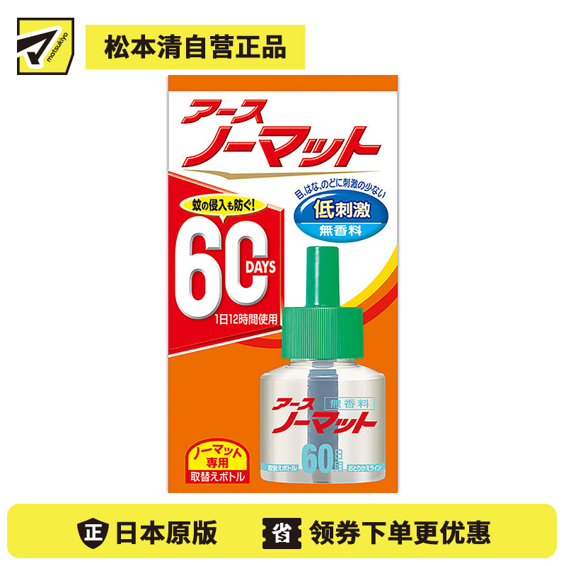 [商品名称] Earth 持续挥散 驱蚊防蚊 驱蚊液替换装 60日用 无香 45ml 低刺激温和 长时间有效 不刺激眼鼻喉