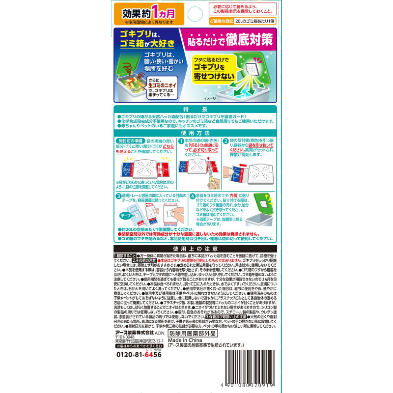 1.如万一出现身体不适,请立即就医,并告知专业人士本品含有薄荷油成分。2.本品并非用于消灭蟑螂的产品。如需进行蟑螂清除处理,建议选择诱饵型灭蟑产品。3.请遵守规定的使用方法与用量,勿用于指定用途以外的场景。4.使用时请勿将内容物从容器中取出,应保持原状直接使用。5.若从垃圾桶盖上不易取下容器时,可在胶带与盖子之间插入刮片等工具,缓慢取下,并注意避免损伤垃圾桶。6.即使超过使用期限仍可能残留香气,但效果可能减弱,建议以 约1个月 为更换参考。7.本品不可食用。如误入口中,请用清水充分漱口;若接触皮肤,请用肥皂认真清洗。8.使用过程中如感到不适,请立即停止使用,并尽快进行通风换气。9.使用中及使用后,请避免让儿童或宠物接触。10.使用后的产品请避免被儿童或宠物玩弄,不要挪作他用,应按各地规定作为塑料垃圾尽快处理。11.薄荷气味可能附着于塑料、木制或纸制品上,一般通过清洗或放置一段时间可减轻。12.气味可能较难从硅胶制品上去除,请避免在其周围使用。13.为避免变形或变色,请勿在泡沫塑料制品、聚氨酯涂层或漆器制品附近使用。14.请避免在火源附近、阳光直射或高温环境中使用或放置,并置于儿童、需他人照护者及宠物无法触及的位置。15.存放时请避开直射阳光,选择阴凉处保存,并同样放置于儿童及宠物无法触及的地方。