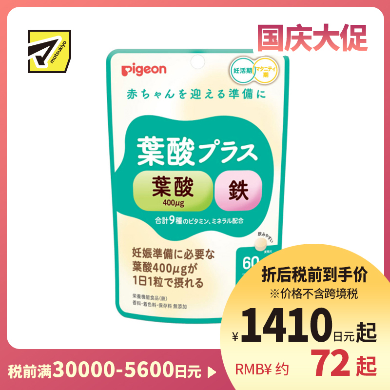 [商品名称] 贝亲 备孕孕期适用 天然成分 优质配方设计 叶酸加铁营养补充片 60片 Pigeon 增强体力 孕前准备 维生素 矿物质