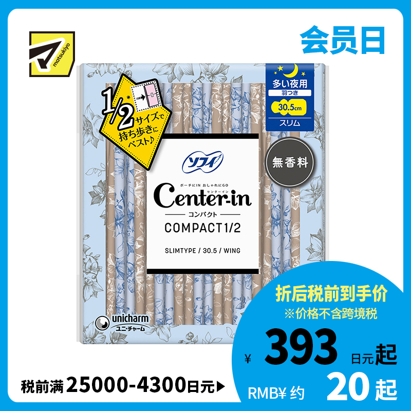 [商品名称]UNICHARM尤妮佳 SOFY苏菲 centerin1/2小口袋系列超薄便携无香量多夜用卫生巾 305mm 12片