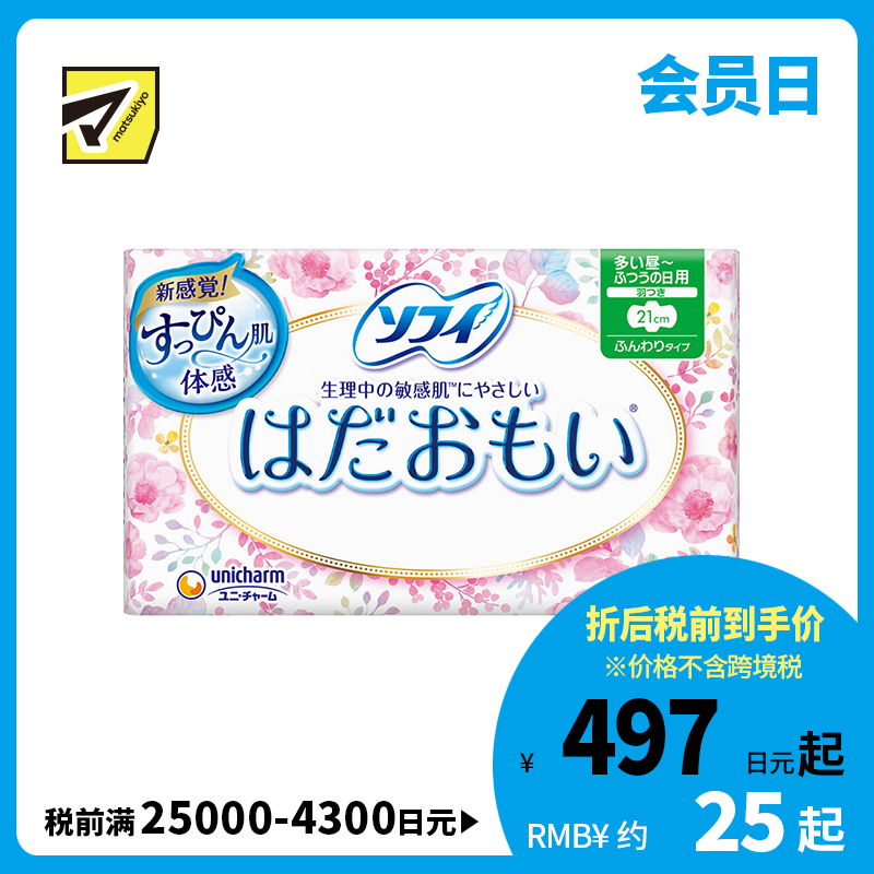 [商品名称]UNICHARM尤妮佳 SOFY苏菲 温柔肌纤巧棉柔瞬吸无荧光剂普通日用卫生巾 带护翼 210mm 26片