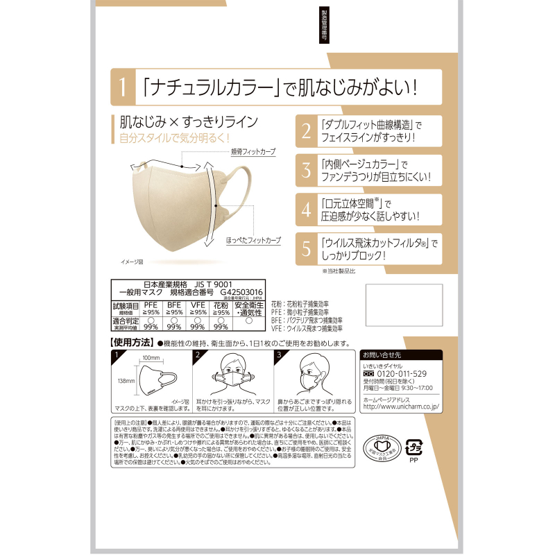 即使不用鼻夹也几乎没有间隙,实现史上最轻量的超级舒适设计!立体形状减少了压迫感,自然色彩易于融入日常使用中。此外,产品采用了细长柔软的挂绳,不易引起耳阔痛。本品使用了99%的过滤材质,可放心使用。