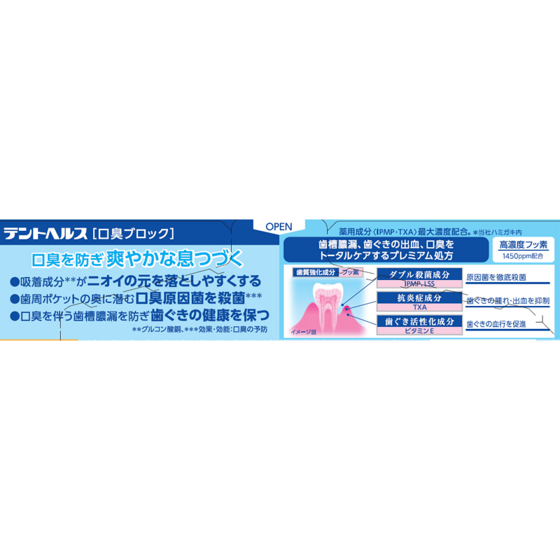 [商品介绍] 如果在意与人交谈时的气息,却又担心牙龈出血、牙周问题反复出现,这支预防口臭 深度杀菌 牙龈护理 牙膏,正是为这样既关注口气清新,也重视牙龈健康的人士准备。不仅帮助预防口臭,还针对牙周病菌引起的口气问题进行护理。配方中添加吸附成分葡萄糖酸铜,有助于清除异味来源。并可深入牙周袋内,杀菌成分IPMP(异丙基甲基苯酚)作用于口臭原因菌,帮助预防口气困扰。同时搭配抗炎成分TXA(氨甲环酸),帮助缓解牙龈红肿与出血。维生素E促进牙龈血液循环,为牙龈状态提供支持。采用清爽的清新薄荷香型,让刷牙后口气清新感更持久。含高浓度氟1450ppm,在日常护理中帮助预防龋齿。在关注口气的同时,也兼顾牙龈与牙齿的整体护理。