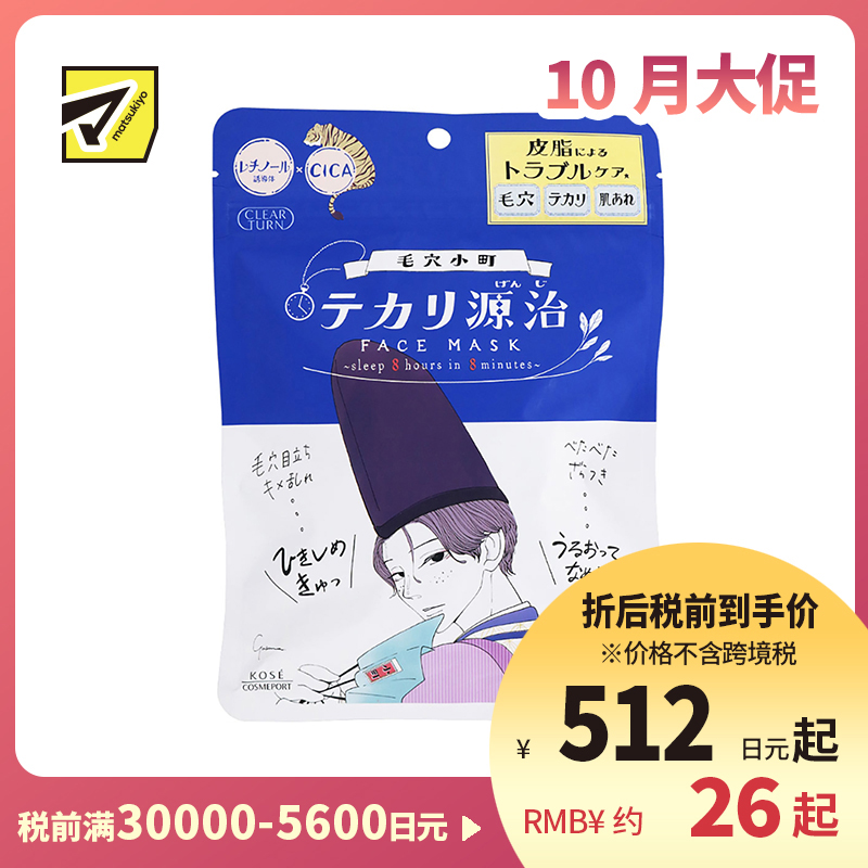 [商品名称]高丝CLEAR TURN 补水去油光滑 毛孔小町面膜 7片装 KOSE 细腻皮肤 清爽不油腻 毛孔小镇