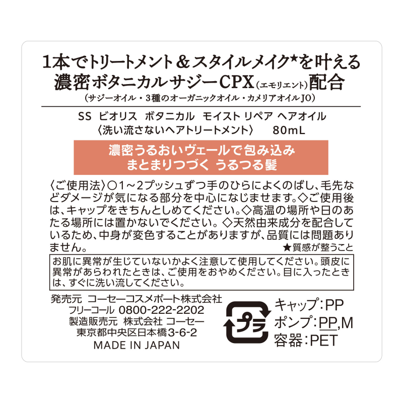 [商品名称] 高丝BIOLISS 含植物护养成分 滋润修护 改善毛躁分叉 严重受损发质适用 免洗护发精油 80ml 佛手柑玫瑰香 滋润柔滑 修护干枯