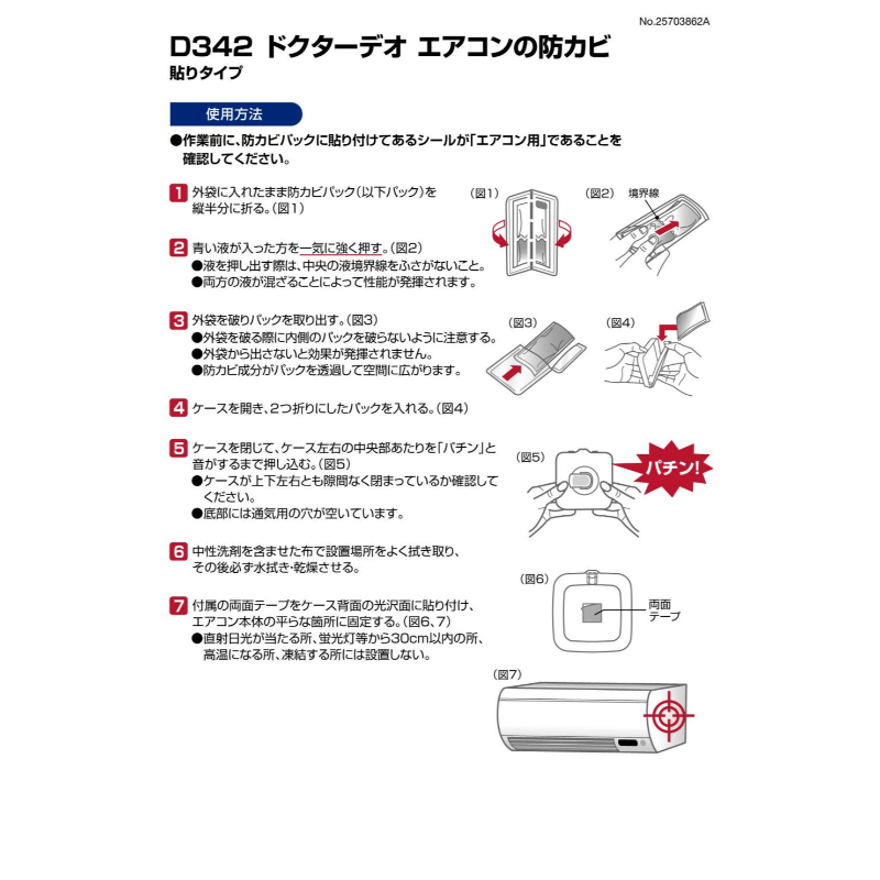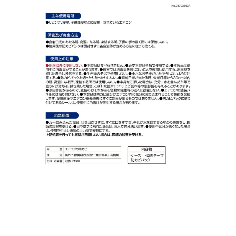[注意事项] 1. 请勿用于其他用途。2. 本产品不可食用。3. 请务必单独使用本产品。4. 使用过程中,本产品或会散发消毒气味。5. 在卧室使用前,请确认是否感受到消毒气味。如感受到消毒气味,请进行通风。6. 请勿在生物附近使用。7. 请注意,防止小孩玩弄。8. 请勿剪开或撕破防霉除臭包。9. 请勿在阳光直射处、距离日光灯等30厘米以内的地方、高温处或会结冰的地方使用。10. 如果内容物溢出,请立即用湿布等充分擦拭干净。如有残留,可能会对溢出部位造成污渍或裂痕等不良影响,敬请留意。11. 因具有漂白作用,请勿放置在可能褪色的彩色纤维等附近。12. 请勿贴在空调的涂装面板上。13. 本产品的防霉除臭成分充分进入空调内部后,才能发挥性能。刚安装或空调刚启动时不会立即见效,敬请留意。14. 粘贴在防霉除臭包上的标签在使用过程中可能会发生褪色现象,敬请留意。