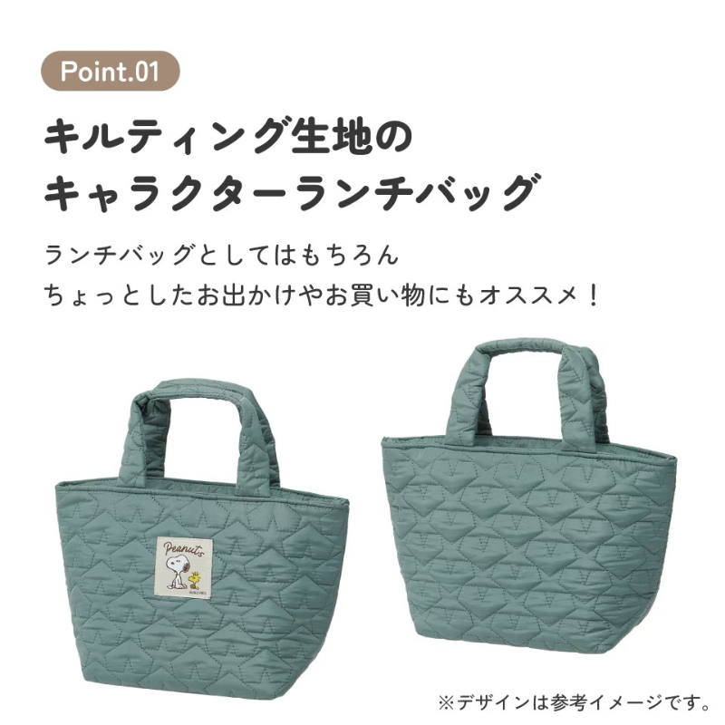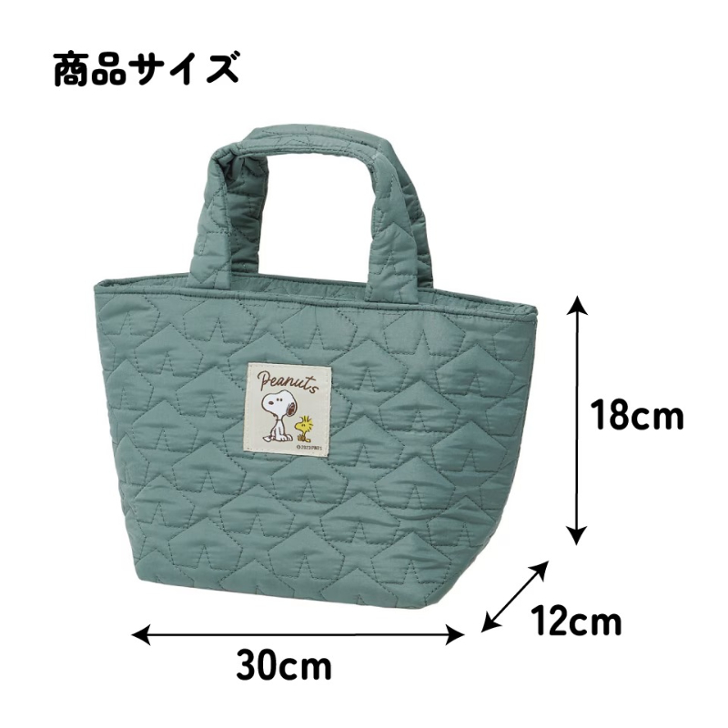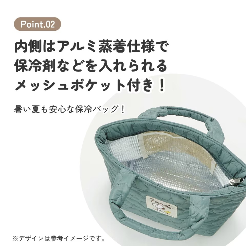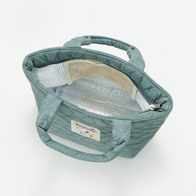 [商品介绍] 整体采用柔软的绗缝面料,外观简洁耐看,搭配史努比布标,日常使用也不会显得突兀。包内侧使用铝蒸着材质,有助于维持餐盒的温度状态,无论是装便当、零食还是饮料,都能更安心随身携带。整体尺寸约为宽300mm × 高180mm × 底部宽120mm(不含提手)。拉链开合设计让收纳更方便,内侧还贴心设置了网状内袋,可以放置保冷剂或小物件,减少翻找的不便,既适合上班、上学使用,也能作为日常外出的小手提袋。