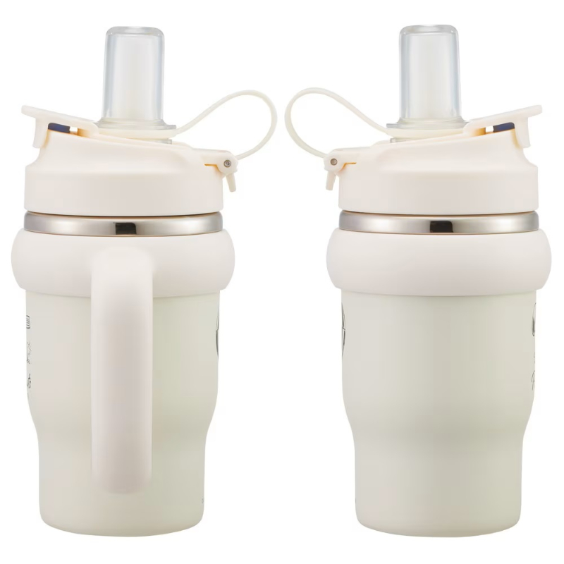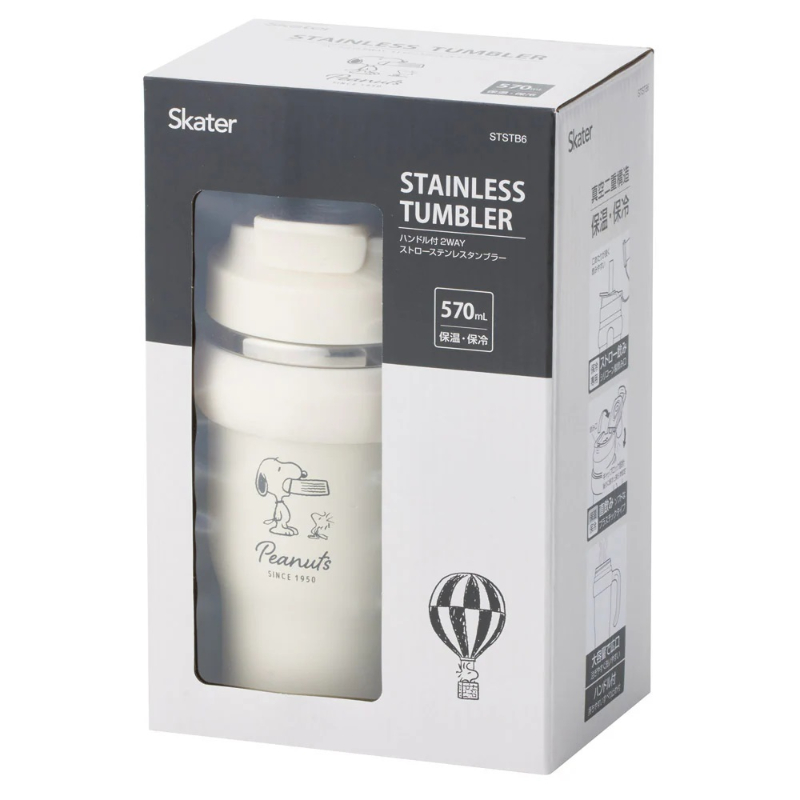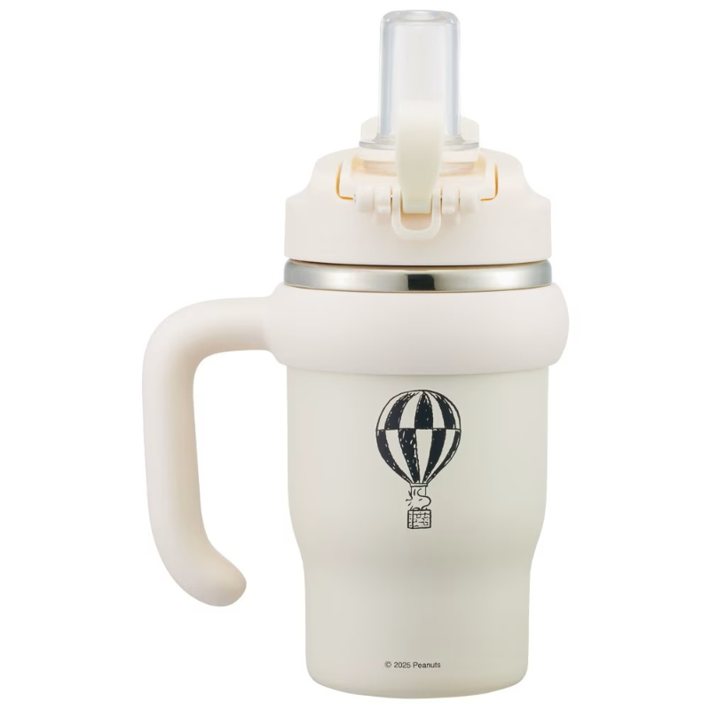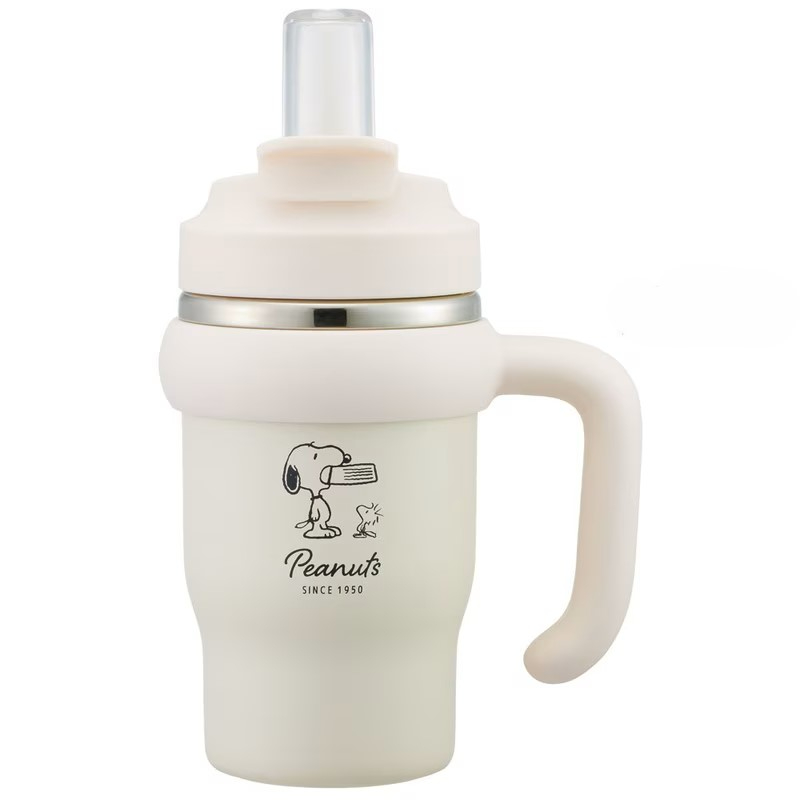 [商品介绍] 一款带手柄设计的不锈钢双饮口杯,约570ml容量,在外出通勤、上学或日常活动时更从容补水。真空双层结构具备保温与保冷表现,约6小时可保持48度以上或11度以下的饮用温度,减少频繁更换饮品的麻烦。可以根据使用习惯选择口感柔和、饮用顺畅的硅胶吸管方式,或切换为软质塑料直饮方式,满足不同场景下的饮用需求。饮用时杯盖向后推倒后可固定,不易回弹遮挡,贴心的锁定结构也有助于减少盖子回落带来的不便。广口设计便于倒入饮品与日常清洁,加上防滑手柄,握持更稳,让你在忙碌或移动中也能安心使用,兼具实用与可爱的史努比图案点缀,为日常补水增添一份轻松感。