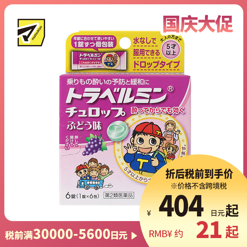 [商品介绍] 用于预防和缓解因乘车、乘船等引起的眩晕、恶心和头痛,帮助出行更加舒适安心。采用儿童易服用的含片设计,无需用水吞服,即使在出发前的忙碌时刻或感到不适时,也能随时服用。葡萄风味,口感更佳。