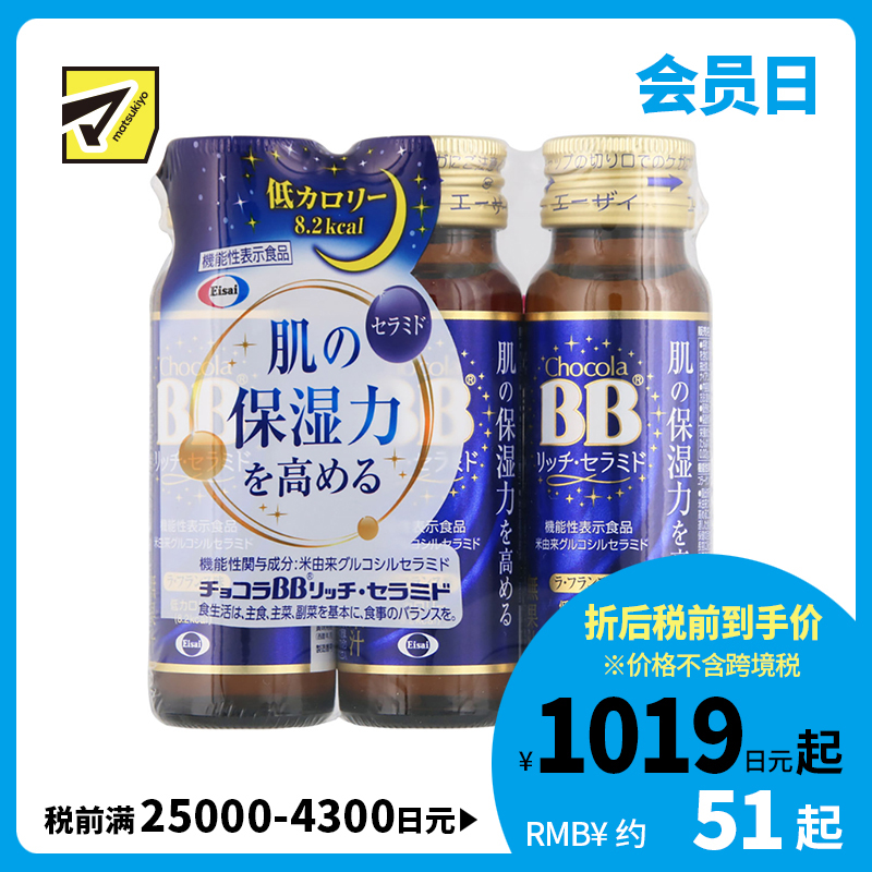 [商品名称]Eisai chocola BB神经酰胺胶原蛋白保湿补水口服液 低热量 不含咖啡因 50ml×3