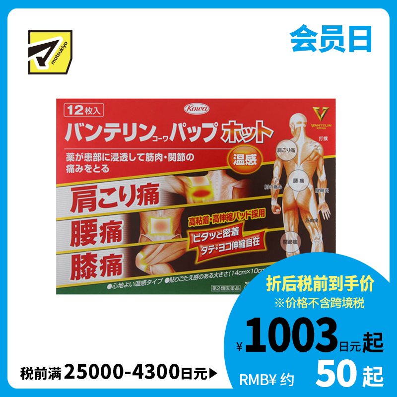 [商品名称]KOWA兴和VANTELIN万特力 温感镇痛膏药贴 缓解腰肩关节疼痛扭伤挫伤14×10mm S 12枚 【第2类医药品】