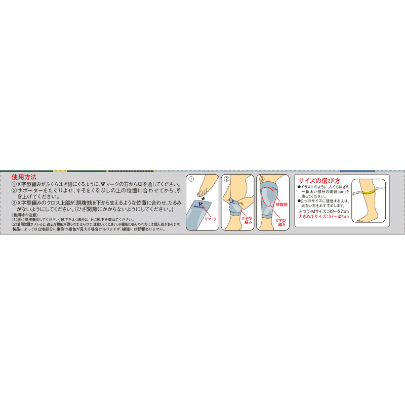 1.请将带有V字标识的一侧朝向小腿肚方向,从V标记一侧将脚套入护套内。2.将护套向上拉起,使下缘对准脚踝上方位置。3.调整位置,使X字型编织的交叉部位位于小腿肚后侧,从下方支撑小腿肌肉,并整理平整,避免出现褶皱。(请勿覆盖膝关节部位)