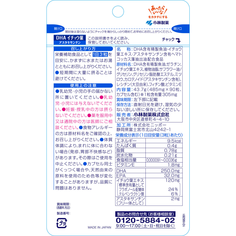 [商品名称] 小林制药 高纯度鱼油 DHA+银杏叶+虾青素 复合营养补充软胶囊 90粒 维持长期健康 无添加