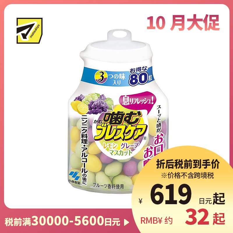 [商品名称]小林制药 BreathCare 口香丸 爽息 咀嚼型咀嚼糖 混合装 柠檬味+葡萄味+麝香葡萄味 80粒