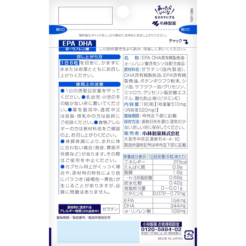 [商品名称] 小林制药 精选青鱼精华 Omega-3复合脂肪酸 营养补充胶囊 180粒 (EPA+DHA+α-亚麻酸) 易于吞服 关注血液循环