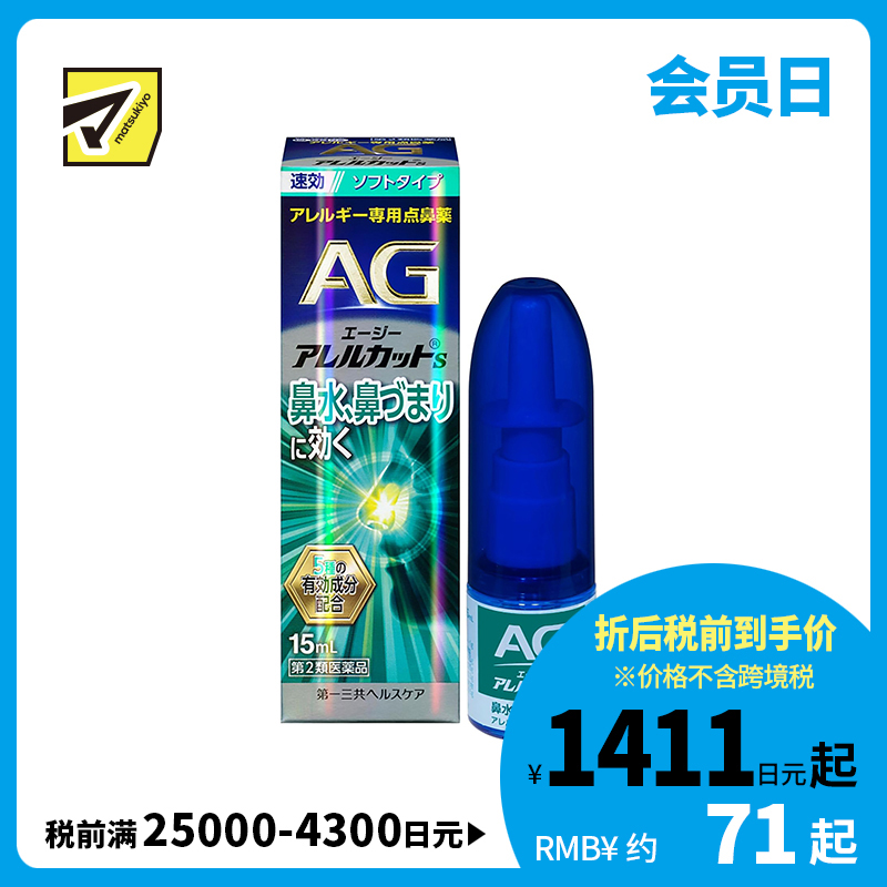 [商品名称]第一三共 快速舒缓鼻涕鼻塞 AG过敏性鼻炎喷雾S 温和型 15ml 抑菌改善鼻黏膜充血 鼻腔喷雾滴鼻剂【第2类医药品】