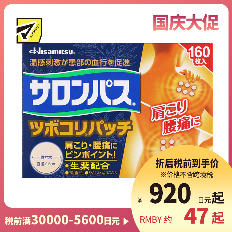 [商品名称] 久光制药 撒隆巴斯 生药配方 缓解肩颈腰痛 小圆贴 160枚 温感刺激 促进血液循环 改善关节疼痛关节炎扭伤 舒缓肌肉疼痛疲劳【第3类医药品】