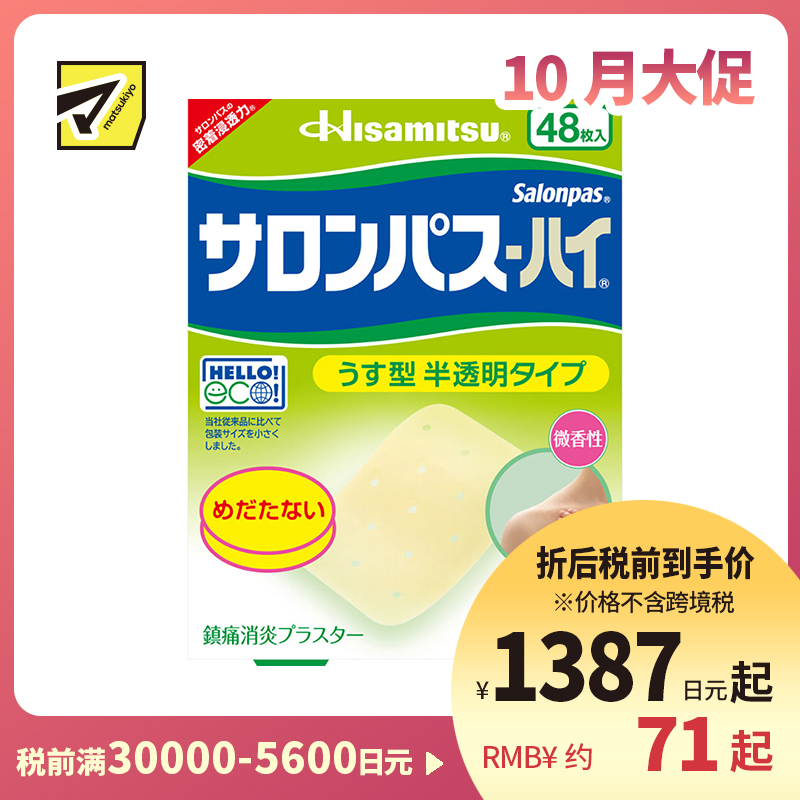 [商品名称]久光制药 撒隆巴斯HAI 半透明薄型无味 舒缓肩颈腰背痛肌肉酸痛膏药贴 48片【第3类医药品】 透明肌色 长效缓解