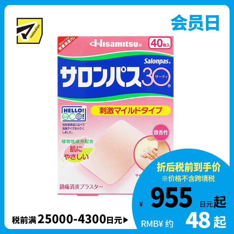 [商品名称]久光制药 撒隆巴斯30 温和不刺激 微香型 肩颈腰背痛肌肉酸痛膏药贴 40片 【第3类医药品】 速效吸收 长效速效舒缓