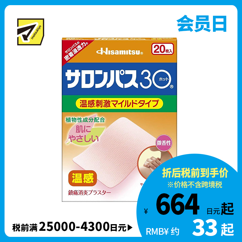 [商品名称]久光制药 撒隆巴斯30 温感热敷 微香不刺激 舒缓肩颈腰背痛肌肉酸痛膏药贴 20片【第3类医药品】长效缓解 镇痛消炎
