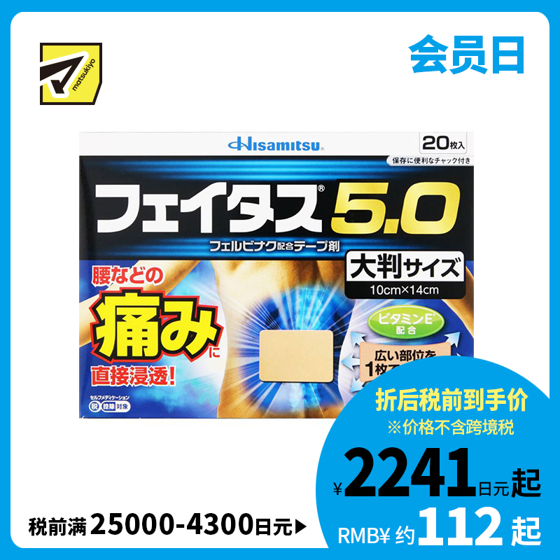 [商品名称]久光制药 斐特斯5.0 扭伤止痛消炎药膏贴 腰部贴大片 10×14cm 20贴