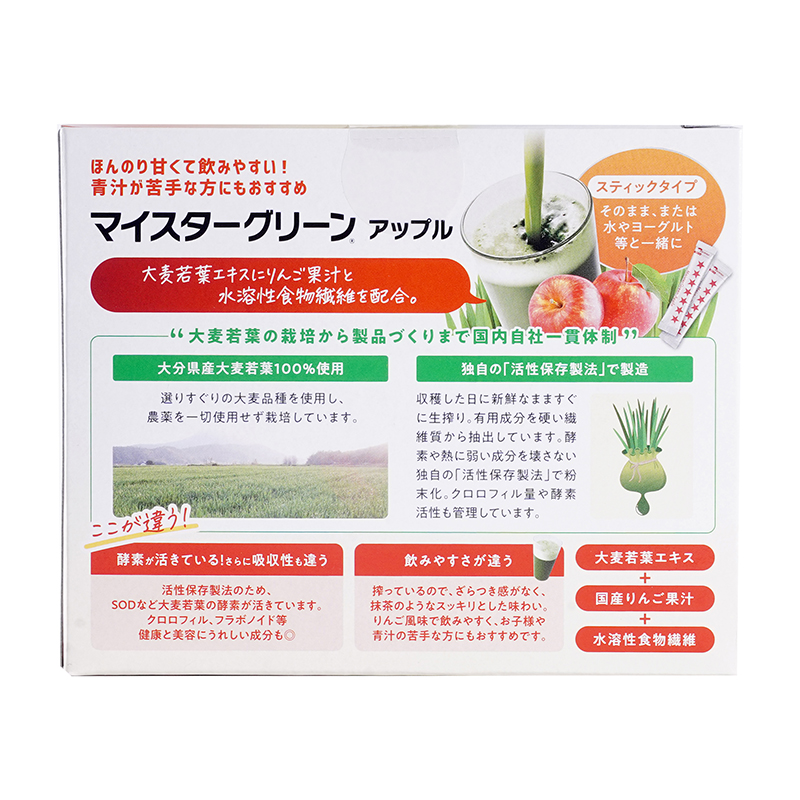[商品介绍] 选用九州产大麦若叶,以生榨方式萃取青汁精华,保留自然酵素活性,再特别加入来自日本国产的苹果果汁,带来淡淡清甜与果香,连青汁新手也能轻松入口。同时还含有水溶性膳食纤维,帮助补充日常膳食中可能缺乏的植物营养。每包3克的小条包装,方便外出携带,也易于控制每日摄取量。是一款兼顾健康与口感、适合全家人日常饮用的果香型青汁饮品。