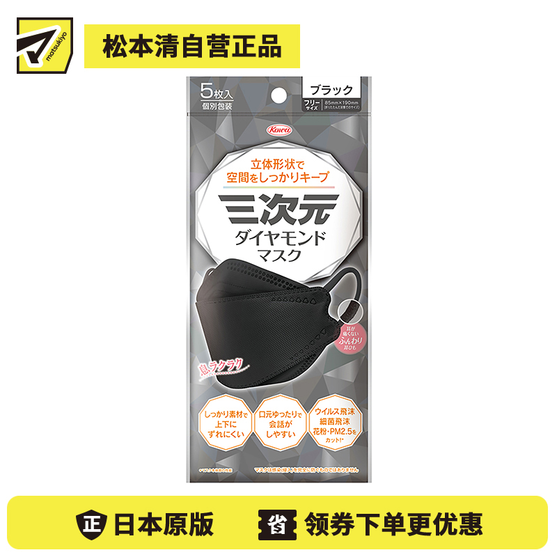 [商品名称]KOWA兴和三次元3D舒适防脱妆透气小颜清凉PM2.5防霾防尘超立体钻石系列口罩 黑色 F尺寸5片